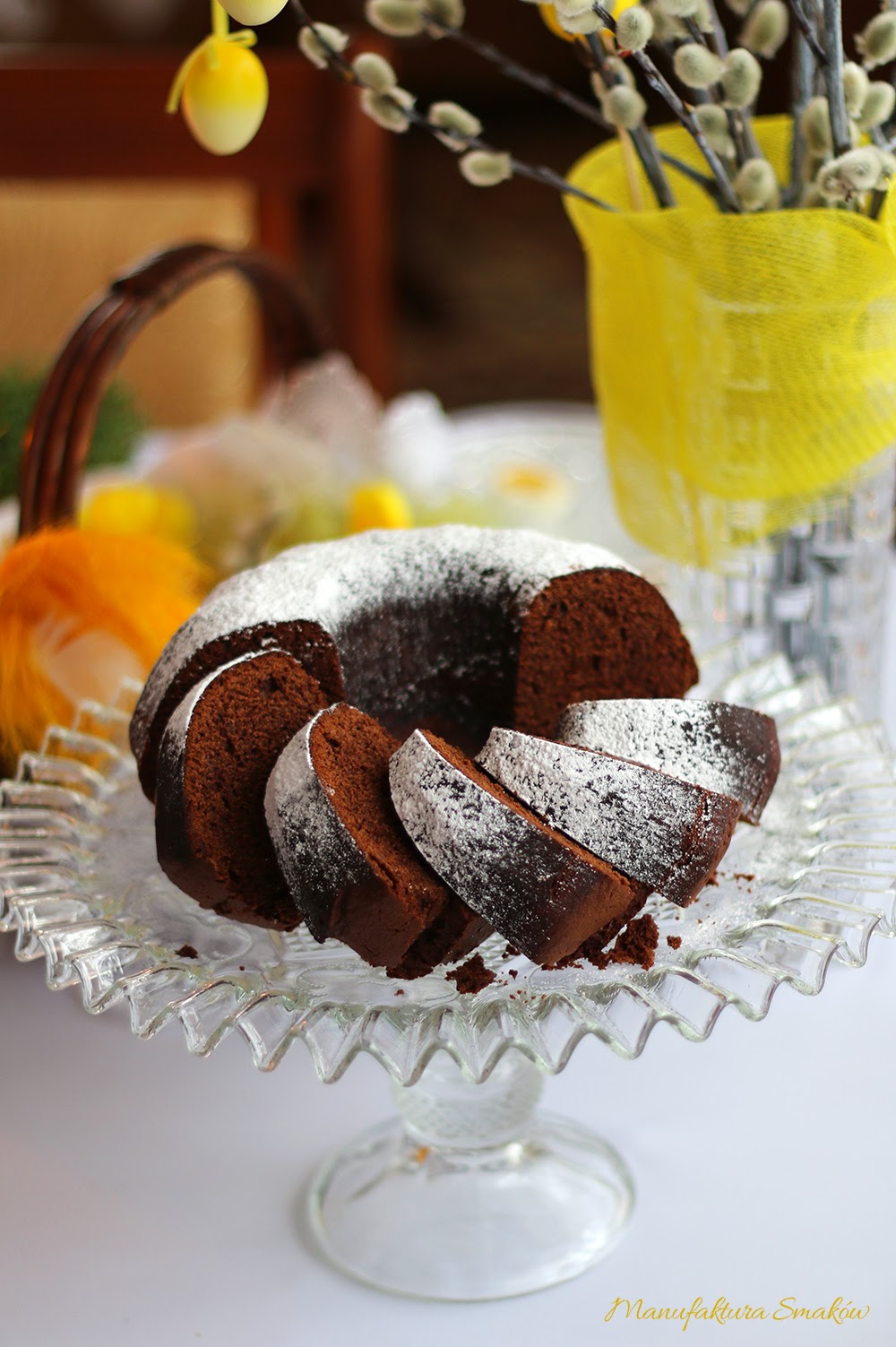 Uwielbiam piec czekoladowe ciasta! Im bardziej czekoladowe, tym lepiej, a jeśli jeszcze przepis jest nieskomplikowany, to po prostu jestem w siódmym niebie. Dziś przedstawiam Wam jedną z moich ulubionych receptur, bo nie dość, że babka jest pyszna i prosta w wykonaniu, to jeszcze nie da jej się zepsuć. Nie opada, nie robi się zakalec, nawet nie wysycha, gdy zabyt długo siedzi w piekarniku i zawsze wychodzi pyszna. Już od kilku miesięcy usiłuję zrobić sesję fotograficzną, ale za każdym razem baka znika w ekspresowym tempie i za każdym razem obiecuję sobie, że następnym razem zrobię dużo zdjęć. W końcu udało mi się dopaść ciasto na stole wielkanocnym i zrobić kilka fotografii. Niestety na sesję z prawdziwego zdarzenia z babką w roli głównej musimy jeszcze trochę poczekać.