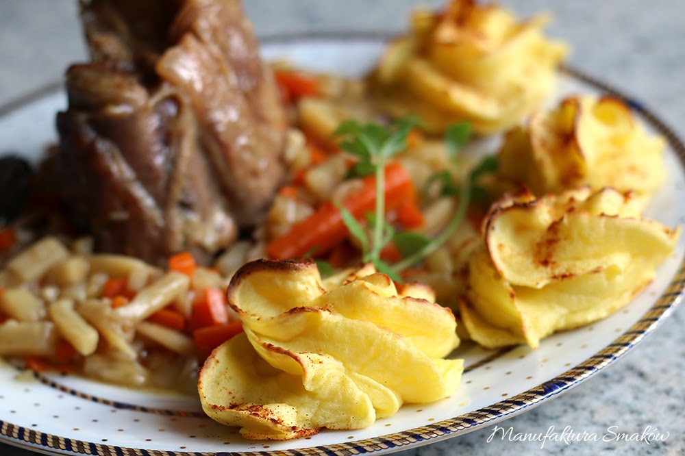 Gicze podajemy z ziemniakami z wody lub z ziemniaczanymi różyczkami (kilk).