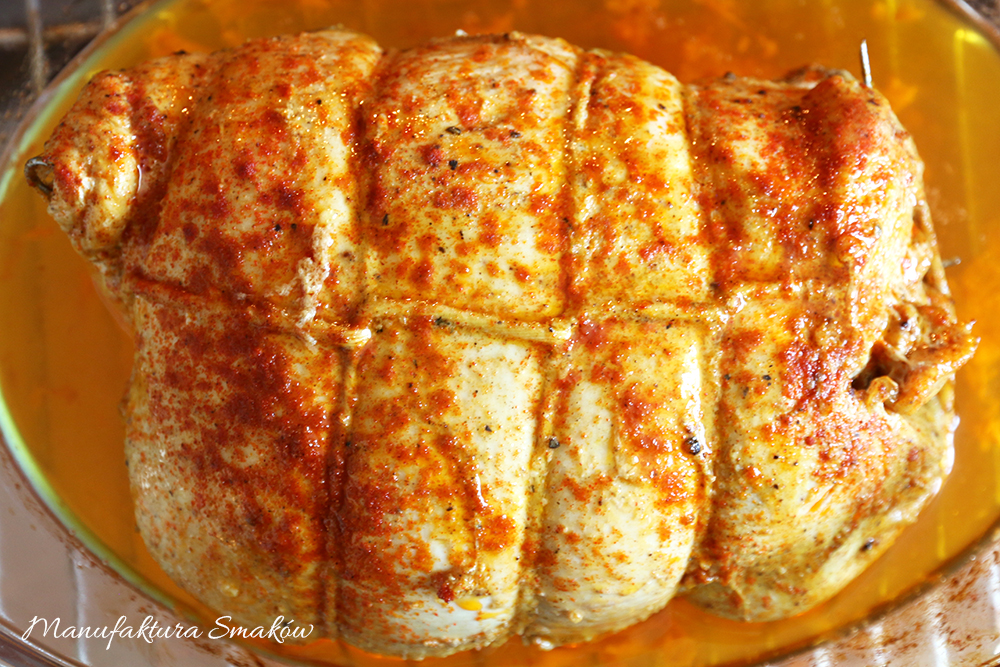 Mięso myjemy, osuszamy papierowym ręcznikiem, a następnie nacieramy solą, pieprzem, curry i czosnkiem. Całość skrapiamy octem winnym i oliwą, pozostawiamy do zamarynowania na około godzinę. Ostrym nożem robimy w mięsie dwa głębokie otwory, które wypełniamy suszonymi pomidorami, nacięcia spinamy wykałaczkami lub metalowymi szpilkami. Tak przygotowaną pierś wiążemy sznurkiem (tak, jak szynkę), aby uformować zgrabną pieczeń. Wkładamy do naczynia żaroodpornego, polewamy oliwą i pieczemy pod przykryciem przez około godzinę, w temperaturze 180 stopni.