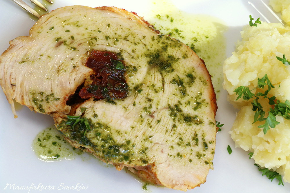 Nie macie pomysłu na niedzielny obiad? Mamy dla was bardzo smaczną i aromatyczną propozycję, indyk faszerowany suszonymi pomidorami, polany zielonym sosem. Nie dość, że przygotowanie pieczeni jest łatwe, to jeszcze całość fenomenalnie komponuje się z aromatycznym, ziołowym sosem. Na pewno zachwyci domowników oraz gości. Na dodatek pieczeń jest również wyśmienita na zimno 🙂