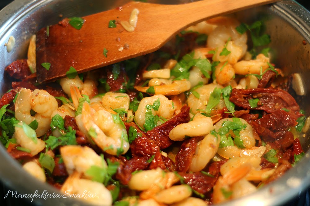 W poniedziałek Ewelina zapytała nas na naszym Facebooku (klik) czy pojawi się jakiś przepis z krewetkami w roli głównej. Odpisałyśmy, że tak, ale dopiero w przyszłym tygodniu. Jednak po dłuższym namyśle doszłyśmy do wniosku, że nie możemy pozostawić Was w napięciu aż do przyszłego tygodnia, więc szybko zrobiłyśmy krewetki z suszonymi pomidorami, a zaraz potem sesję fotograficzną i dziś dzielimy się z Wami tym genialnym przepisem. Oczywiście wieczorem pojawi się kolejny, zapalowany w ramach akcji przepis 🙂