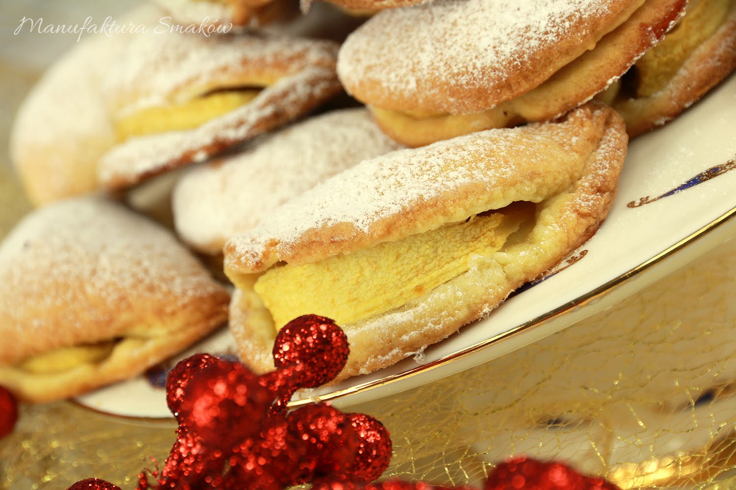 Schłodzone ciasto rozwałkowujemy na opruszonej mąką stolnicy na placek o grubości około 3 mm. Dużą szklanką (obręczą lub formą do pierogów) wykrawamy w cieście krążki, następne w połowie każdego układamy dwie cząstki jabłka. Przykrywamy jabłka pozostałą częścią ciasta. Tak powstałe ciasteczka układamy na wyłożonej papierem do pieczenia blasze, pieczemy przez około 20 min. (na złoty kolor) w piekarniku nagrzanym do 200 stopni. Podajemy posypane cukrem pudrem z cynamonem.