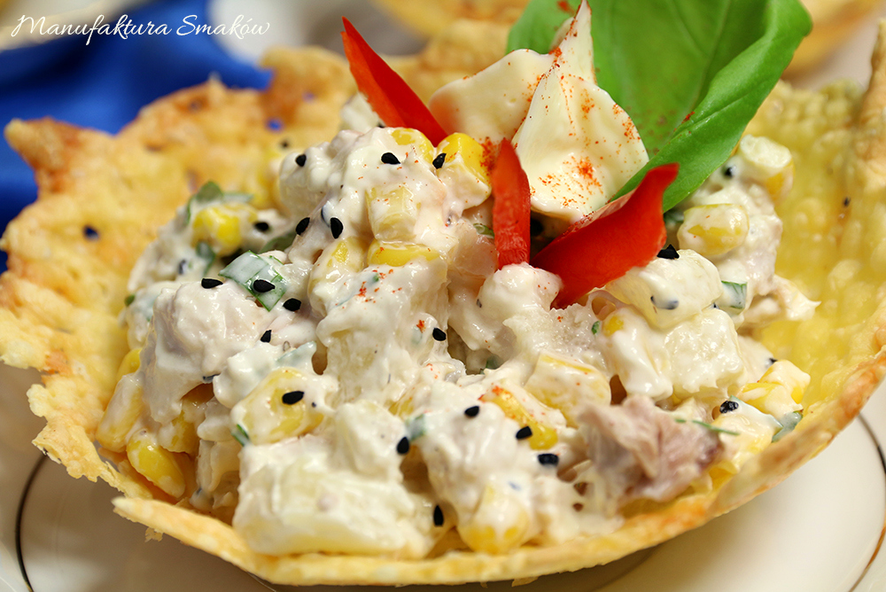 Chyba nikt nie lubi, kiedy marnuje się jedzenie, zwłaszcza, jeśli włożyło się sporo wysiłku w jego przygotowanie. Doskonałym rozwiązaniem na zagospodarowanie mięsa z poprzedniego obiadu, a którego jest trochę za mało, są różnego rodzaju sałatki. My uwielbiamy tę z kukurydzą, ananasem, lubczykiem i odrobiną czarnuszki (bo czarnuszka, to podstawa wszystkiego). A kiedy do tego wszystkiego doda się jeszcze nieszablonowy sposób podania, jakim są serowe miseczki, to z „resztkowego obiadu” powstaje kulinarne arcydzieło. Zapieczony ser doskonale komponuje się z sałatką, a całość jest naprawdę przewyborna. Po prostu palce lizać!