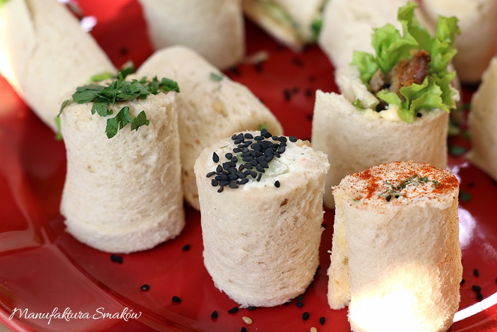 Odcinamy skórkę z kromek chleba i dokłądnie rozwałkowujemy każdą z nich. Następnie układamy ulubione składniki, np. cienką warstwę majonezu, szczypiorek, serek twarogowy i kawałek ogórka (obranego i pokrojonego w słupki) lub cienką warstę majonezu, sałatę i kawałek pasztetu. Całość zawijamy. Do tostowego sushi możemy również wykorzystać pastę z resztek wędlin, w ten sposób nie marnujemy jedzenia 🙂 Nasze sushi możemy udekorować czarnuszką lub czarnym sezamem, posiekanym szczypiorkiem, natką, lubczykiem lub słodką papryką w proszku.