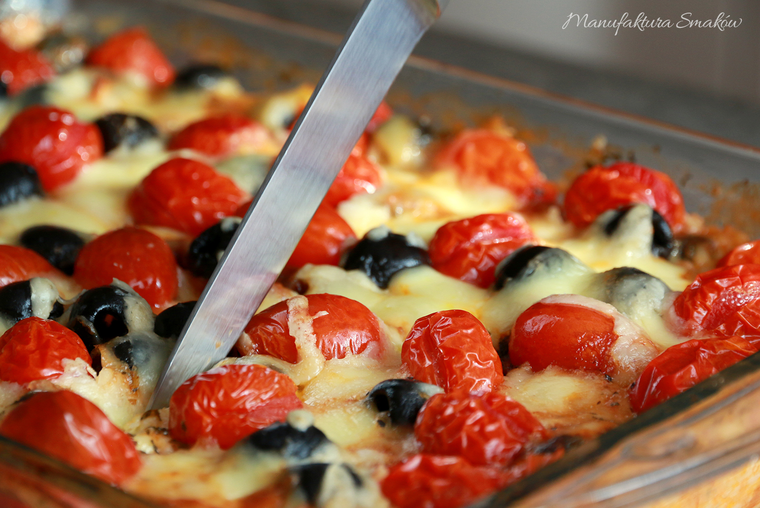 Jogurt mieszamy z jajkiem i połową żółtego sera, doprawiamy solą i pieprzem, a następnie łączymy z ryżem. Naczynie żaroodporne sparujemy oliwą i układamy warstwy zapiekanki – ryż, mięso posmarowane sosem pomidorowym, oliwki, mozzarellę i pomidorki koktajlowe. Całość posypujemy pozostałym żółtym serem i zapiekamy w temperaturze 180 – 200 stopni, aż do zrumienienia górnej warstwy. Zapiekankę pozostawiamy do lekkiego przestygnięcia. Podajemy z sosem z suszonych pomidorów.